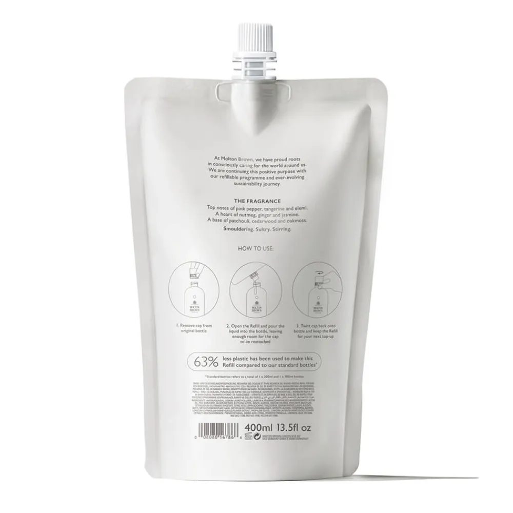 Das Molton Brown Fiery Pink Pepper Bath & Shower Gel Refill verspricht Ihnen ein luxuriöses Dufterlebnis. Die Komposition aus rosa Pfeffer, Muskatnuss und Patchouli entführt Sie in eine Welt voller sinnlicher Aromen. Diese außergewöhnliche Duftmischung sorgt beim Baden oder Duschen für einen Hauch von Extravaganz und verleiht Ihrer Haut einen unvergleichlichen Duft. Die Nachfüllpackung ermöglicht es Ihnen, Ihre wertvolle Glasflasche bequem und ressourcenschonend aufzufüllen. Mit 63 % weniger Kunststoff im Vergleich zu den Standardflaschen setzen Sie ein Zeichen für Nachhaltigkeit, ohne auf Luxus verzichten zu müssen.