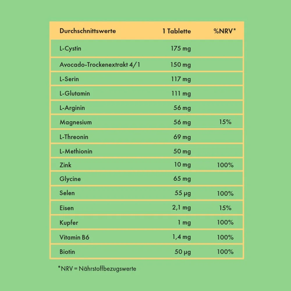 Für gesunde und kräftige Haare und Nägel. Biotin, Zink, Selen wirken ideal bei brüchigen Nägeln und geschwächten/trockenen Haaren. Dieses Nahrungsergänzungsmittel ist ideal im Fall von abgeschwächten/trockenen Haaren und Nägeln. Es enthält Biotin, Eisen, Kupfer, Zink, Arginin, Mineralstoffe, Vitamine und Avocado-Pulver. Biotin und Zink: tragen zur Aufrechterhaltung normaler Haare und Nägel bei. Kupfer: unterstützt die normale Haarfarbe.