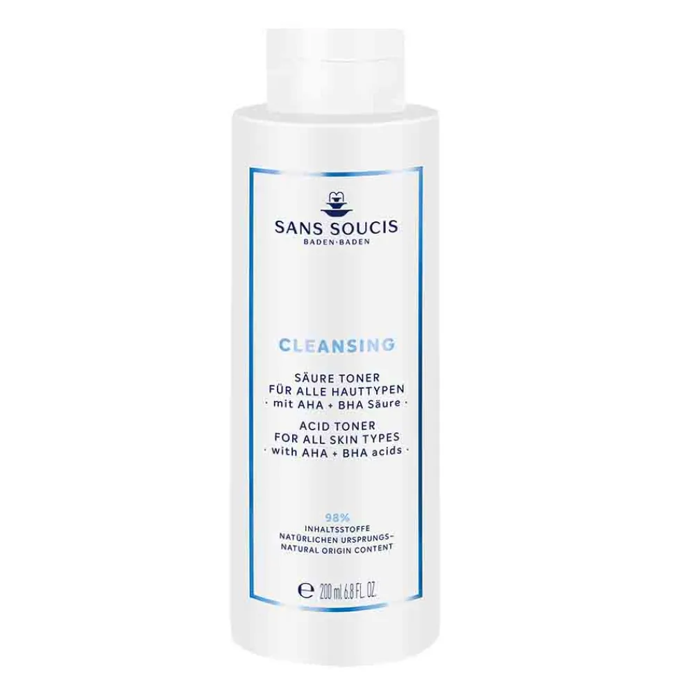 Der Sans Soucis Säure Toner ist das ideale Gesichtswasser für eine porentief gereinigte Haut und einen erfrischten, strahlenden Teint. Die Kombination aus AHA und BHA Säuren entfernt abgestorbene Hautzellen sanft und effizient, während die Zellerneuerung stimuliert wird. Dies glättet die Hautoberfläche und lässt sie sichtbar ebenmäßiger erscheinen. Der Kornblumenextrakt sorgt dafür, dass die Feuchtigkeitsbalance Ihrer Haut unterstützt wird, während Unreinheiten bis in die tieferen Hautschichten reduziert werden. Der Toner ist nicht nur ein Reinigungsprodukt, sondern ein wahres Kraftpaket, das die natürliche Schönheit Ihrer Haut unterstreicht.