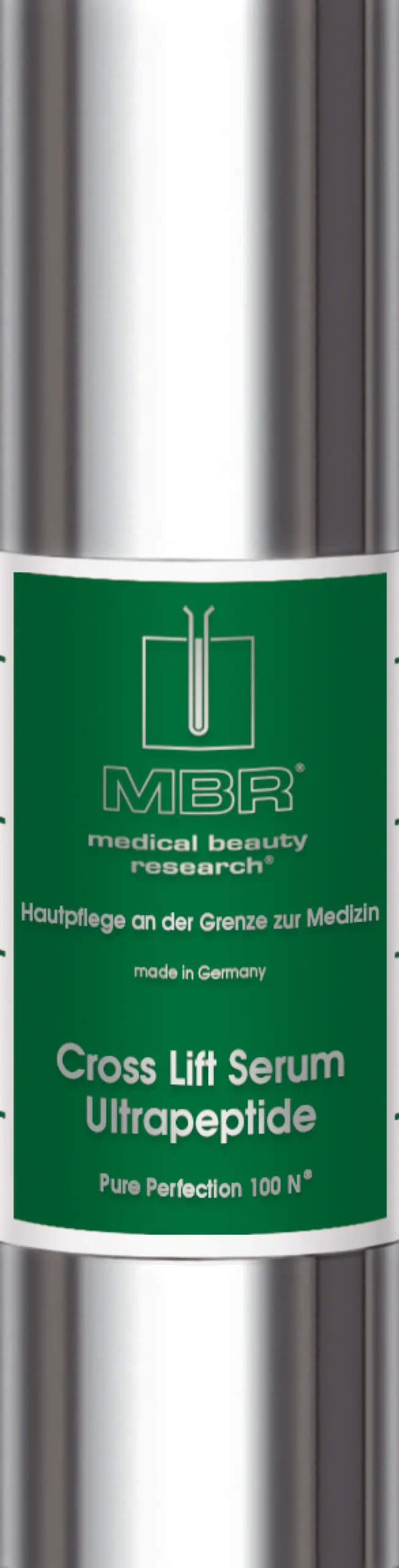 Das MBR Cross Lift Serum Ultrapeptide besticht durch seine elegante Verpackung, die eine Symbiose aus Funktionalität und Stil darstellt. Der schlanke, metallische Flakon verleiht dem Produkt eine moderne und luxuriöse Ausstrahlung, die jeden Badezimmerbereich aufwertet. Das edle Design wird durch das dezente Grün des Etiketts perfekt ergänzt, wobei klare Linien und eine klare Typografie die Wertigkeit des Inhalts widerspiegeln. Jeder Aspekt dieses Flakons ist darauf ausgelegt, sowohl ästhetisch ansprechend als auch praktisch in der Anwendung zu sein.