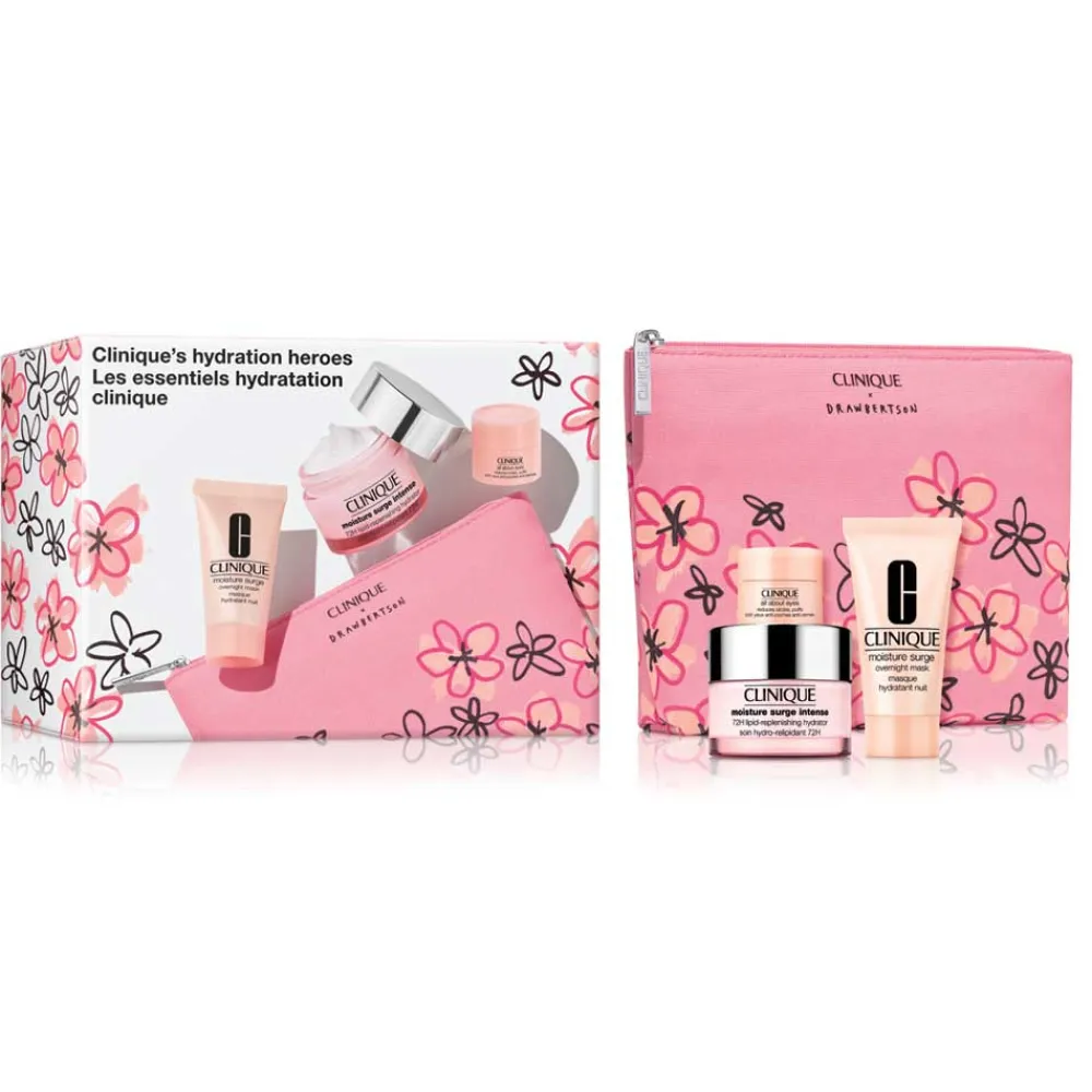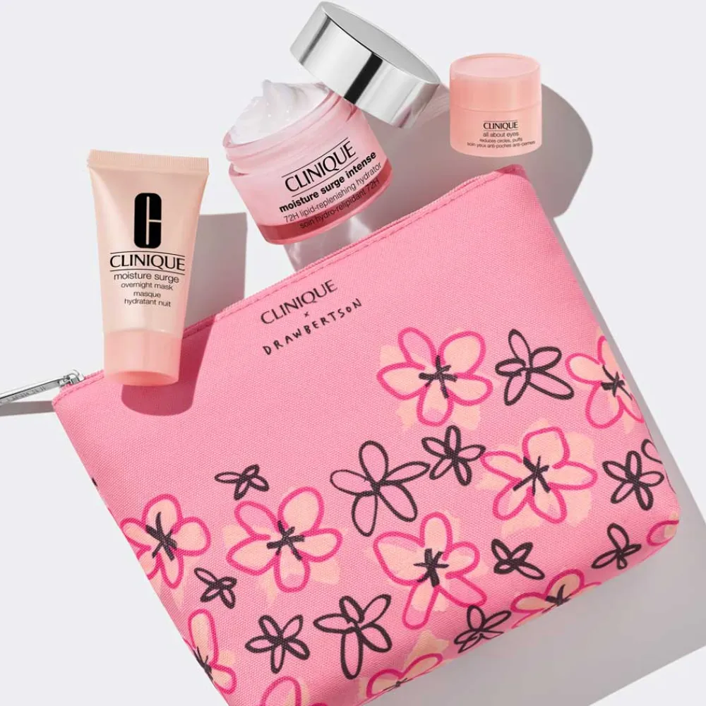 Optisch ansprechend präsentiert sich das Clinique Intense Value Set in einem charmanten, blumig gestalteten Karton, der sofort ins Auge fällt. Die einzelnen Produkte sind in schlichten, aber eleganten Behältern untergebracht. Der Moisture Surge Hydrator beeindruckt mit seinem zarten, pastellrosa Tiegel, der ebenso stilvoll wie funktional wirkt. Die Overnight Mask kommt in einer handlichen Tube, die sich ideal für die Anwendung in der Nacht eignet. Die All About Eyes Creme, in einem kleinen, kompakten Tiegel, ergänzt das Set und verspricht einfache Handhabung. Abgerundet wird das Set durch eine bezaubernde Kosmetiktasche in einem passenden floralen Design, die nicht nur praktisch ist, sondern auch optisch eine Freude bereitet.