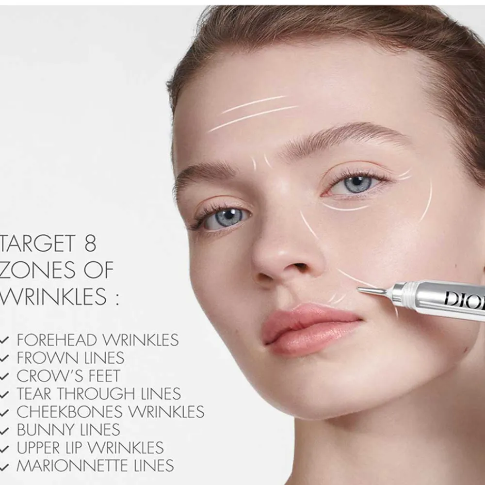 Er besteht zu 97%* aus Inhaltsstoffen natürlichen Ursprungs und zielt auf die 8 Faltenzonen des Gesichts ab: Stirnfalten, Zornesfalten zwischen den Augenbrauen, Krähenfüße an den äußeren Augenwinkeln, vertikale Falten auf den Wangenknochen, Bunny Lines am oberen und seitlichen Teil der Nase, Oberlippenfalten und Marionettenfalten an den unteren Lippenwinkeln.