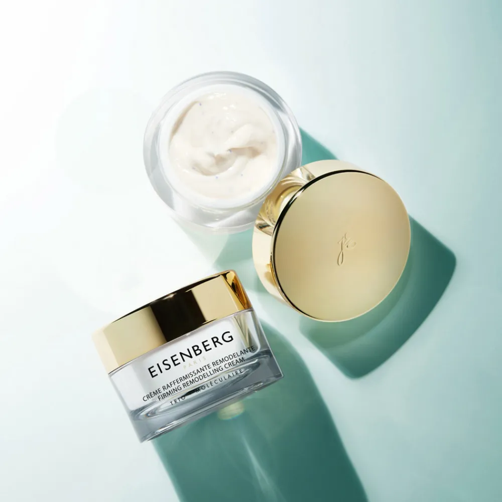 Optisch überzeugt die EISENBERG Crème Raffermissante Remodelante mit einem klaren, eleganten Design. Der Tiegel besticht durch seine harmonische Form und den edlen goldfarbenen Deckel, der einen luxuriösen Akzent setzt. Die transparente Umhüllung lässt den hochwertigen Inhalt erahnen und fügt sich nahtlos in jede anspruchsvolle Pflegeroutine ein. Jede Linie und jeder Winkel des Designs strahlt Raffinesse und Stilbewusstsein aus. Dieses durchdachte Erscheinungsbild macht das Produkt nicht nur zu einem Pflegehighlight, sondern auch zu einem optischen Genuss für Ihr Badezimmer.
