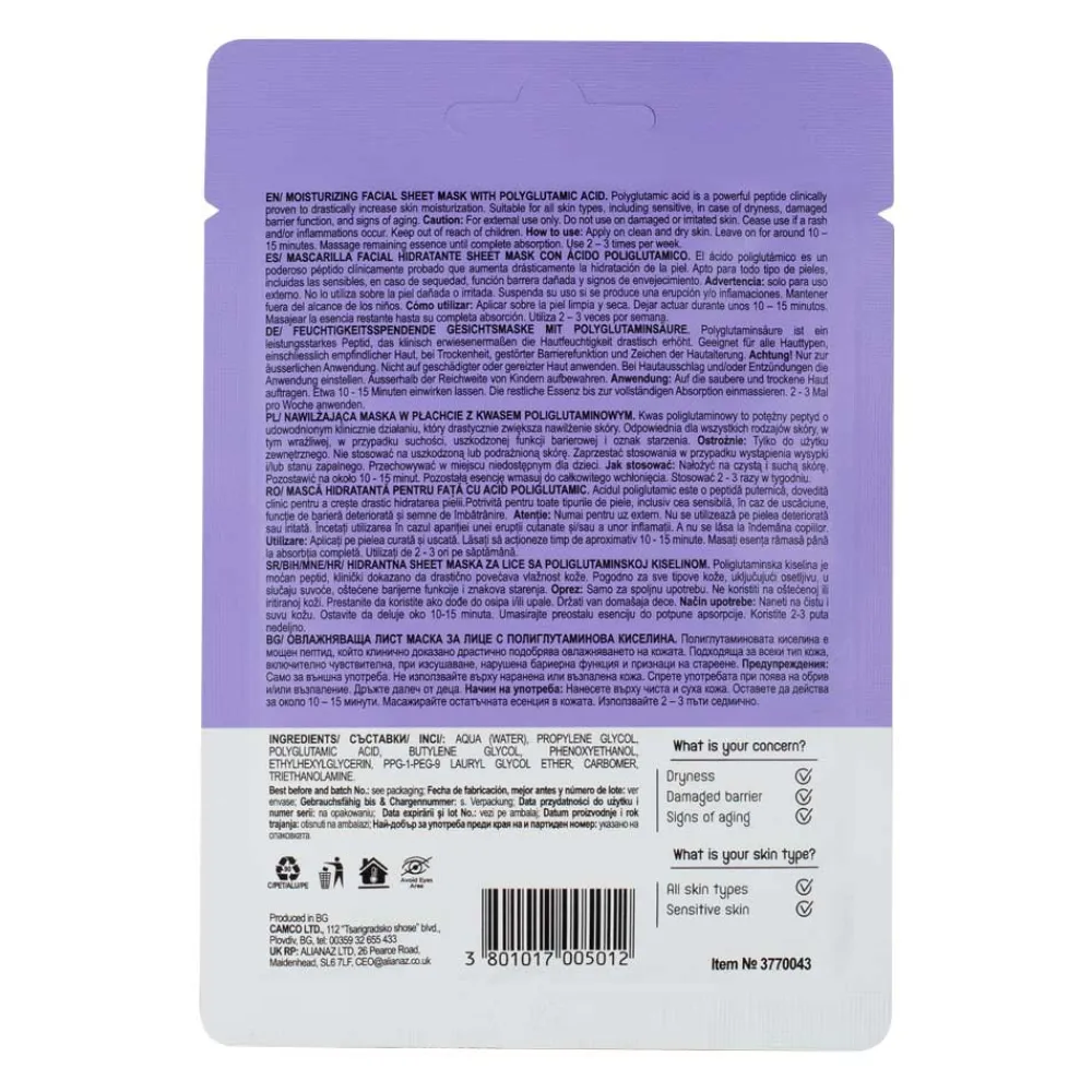 Die Skincyclopedia Moisturizing Facial Sheet Mask bietet eine intensive Feuchtigkeitsversorgung, die Ihre Haut revitalisiert. Mit der Kraft der Polyglutaminsäure, einem klinisch getesteten Peptid, wird die Feuchtigkeit in den tieferen Hautschichten merklich gesteigert. Diese Gesichtsmaske ist optimal für jeden Hauttyp, sei es empfindliche, trockene oder alternde Haut. Besonders bei Anzeichen von Hautalterung oder einer geschädigten Hautbarriere erweist sie sich als hilfreich. Ihre Haut wird spürbar glatter und geschmeidiger, während der Hautschutzmantel gestärkt wird. Bitte verwenden Sie die Maske ausschließlich äußerlich und vermeiden Sie die Anwendung auf gereizter Haut. Bei Hautirritationen sollten Sie die Anwendung unterbrechen.