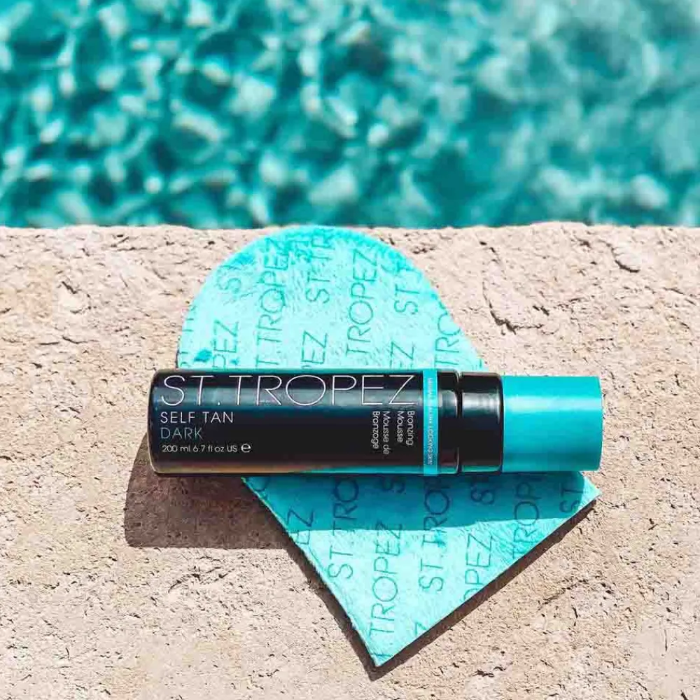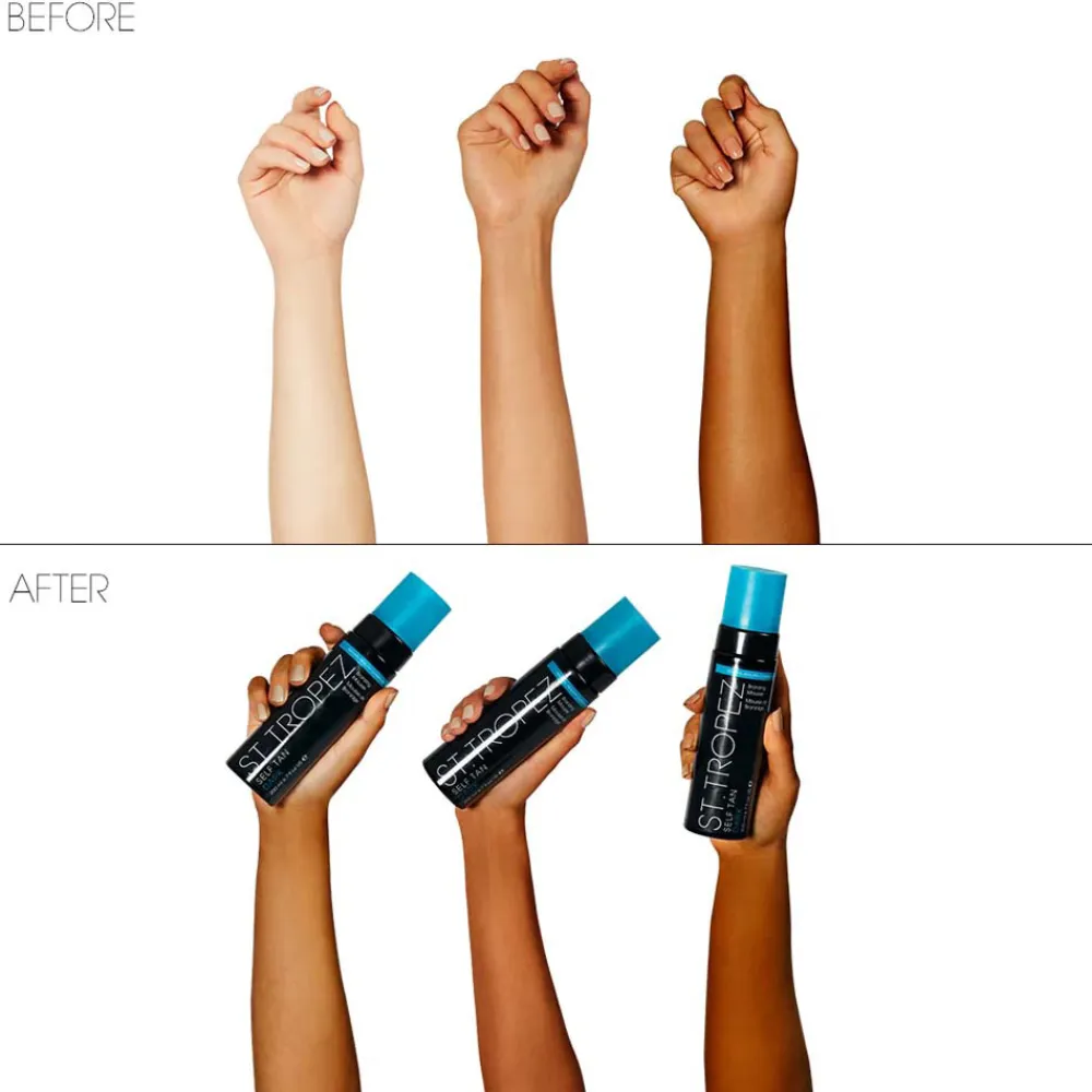 Der elegante Flakon des St. Tropez Dark Bronzing Mousse ist ein visuelles Highlight in jedem Badezimmer. Mit seiner schlanken Form und dem edlen schwarzen Design, akzentuiert durch leuchtend blaue Details, wirkt er sowohl modern als auch stilvoll. Die praktische Pumpfunktion ermöglicht eine saubere und präzise Dosierung, während die dunkle Grundfarbe des Mousses eine mühelose und gleichmäßige Anwendung gewährleistet. Dieses durchdachte Design verleiht nicht nur ein Gefühl von Luxus, sondern sorgt auch dafür, dass das Mousse mühelos in Ihre tägliche Pflege integriert werden kann.