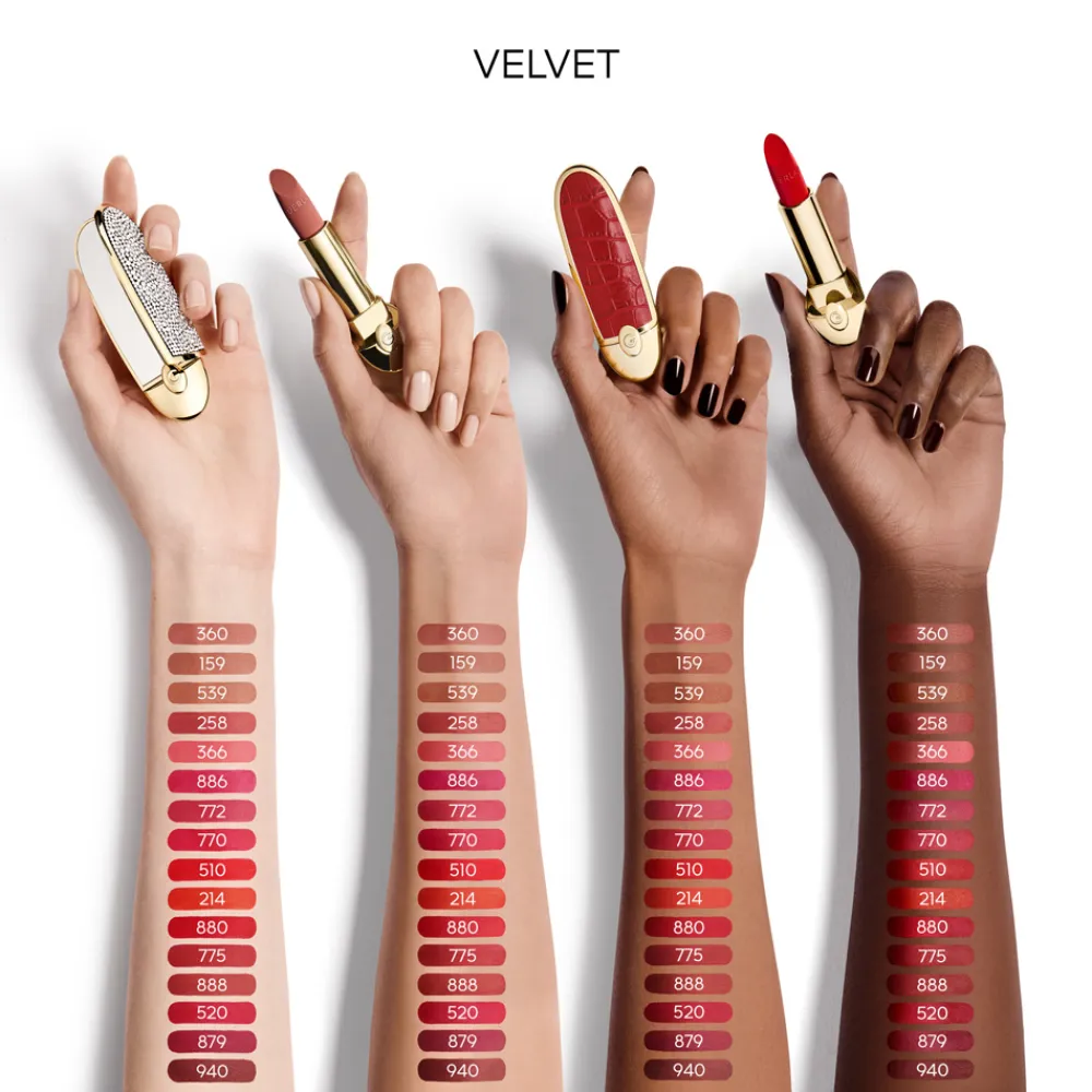 Der Guerlain Velvet Refill besticht durch sein luxuriöses Design, das Funktionalität mit ästhetischer Anmut verbindet. Die goldglänzende Hülle, geschwungen und dennoch markant, verleiht dem Lippenstift ein edles und modernes Aussehen. Ein elegantes G-Logo schmückt den Verschluss, der durch seine geschmeidige Mechanik beeindruckt. Das Design ist nicht nur visuell ansprechend, sondern auch haptisch ein Genuss. Die Möglichkeit, die Hülle zu wechseln, eröffnet unzählige Stilvariationen und macht diesen Lippenstift zu einem dauerhaften Begleiter, der immer wieder neu interpretiert werden kann.