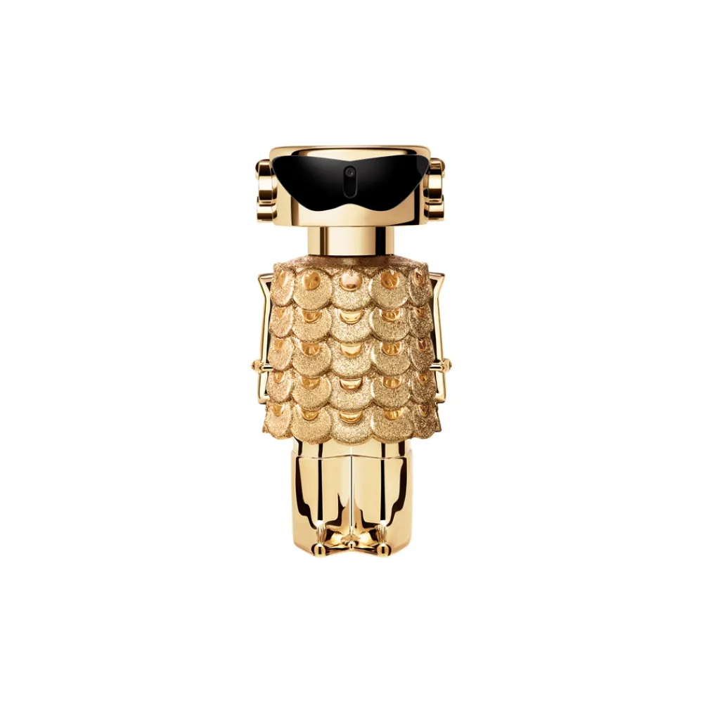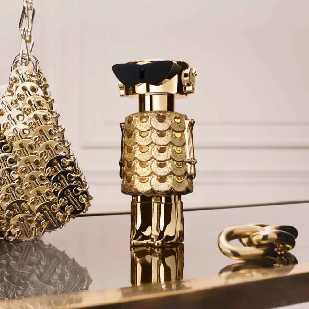 Der Flakon des rabanne Eau de Parfum Intense Spray zieht sofort alle Blicke auf sich. Sein Design besticht durch eine futuristische Ästhetik, die durch glänzende, goldene Oberflächen und eine innovative Form besticht. Die strukturierte Gestaltung erinnert an funkelnde Schuppen, die das Licht auf faszinierende Weise reflektieren. Der obere Teil des Flakons wirkt wie ein eleganter Helm, der die avantgardistische Linie von Rabanne unterstreicht. Diese optische Kreation ist nicht nur ein Duft, sondern ein stilvolles Accessoire, das Ihre Parfum-Sammlung bereichert.