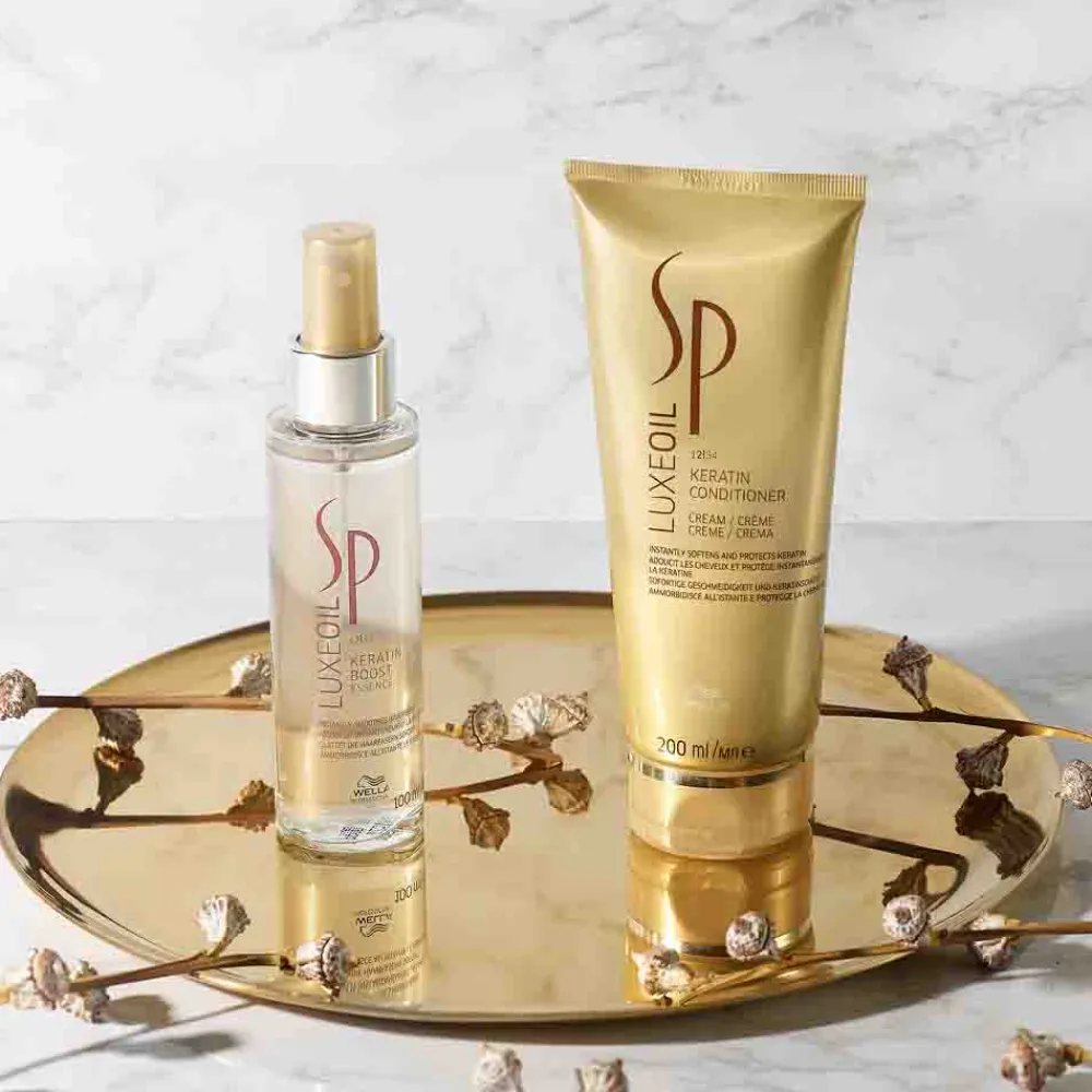 Die Wella SP Keratin Boost Essence besticht durch ihr elegantes Design. Der schlanke, transparente Flakon mit einem goldenen Akzent strahlt zeitlose Eleganz und Raffinesse aus. Der praktische Sprühkopf ermöglicht eine gezielte und gleichmäßige Anwendung, während das edle Design im Badezimmer ein Highlight setzt. Die subtile Farbgebung und die hochwertige Verarbeitung unterstreichen den luxuriösen Charakter des Produkts und machen es zu einem stilvollen Begleiter für Ihre Haarpflege-Routine.