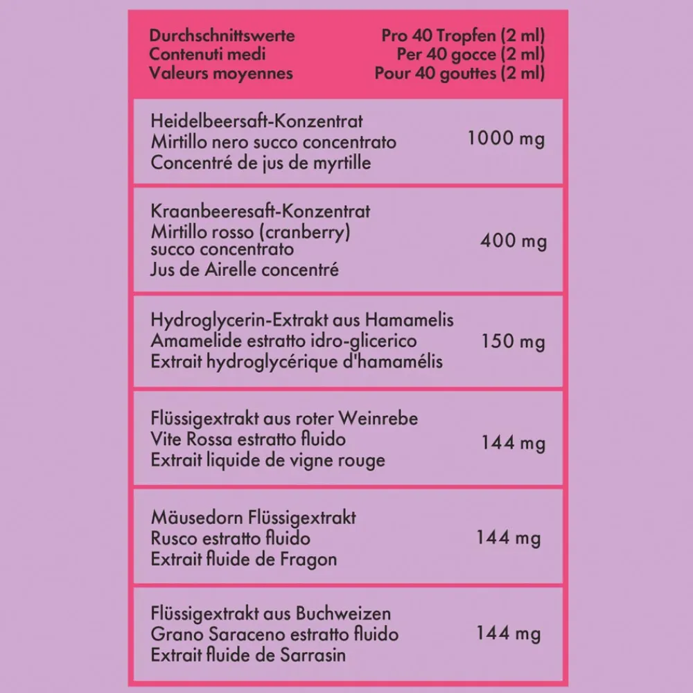 Nahrungsergänzungsmittel als Tropfen zum Einnehmen – zur Verbesserung der Mikrozirkulation, der Funktionsfähigkeit des venösen Kreislaufs und zur Verringerung von Flüssigkeitsstau in den Beinen. Hilft, das Schweregefühl und die Müdigkeit der Beine zu lindern.Auf Basis von roter Weinrebe, Heidelbeere und Buchweizen, die die Funktionsfähigkeit der Mikrozirkulation fördern (sie wirken dem Schweregefühl in den Beinen entgegen), sowie Hamamelis und Mäusedorn, die die Funktionsfähigkeit des venösen Kreislaufs unterstützen. Ideal bei Schweregefühl und Schwellungen der Beine und schwachen Kapillargefäßen. Für eine noch größere Wirkung kannst du das Produkt in Kombination mit GIVE ME DETOX oder SHAPE YOUR BOOTY anwenden:KOMBI DETOX + LEICHTE BEINEDreifachwirkung: Reinigung + Mikrozirkulation + leichte BeineKOMBI ENTWÄSSERUNG + LEICHTE BEINEDreifachwirkung: gegen Cellulite + Entwässerung + leichte Beine Ohne Zuckerzusatz. HINWEIS: Produkt enthält 6,4% Alkohol