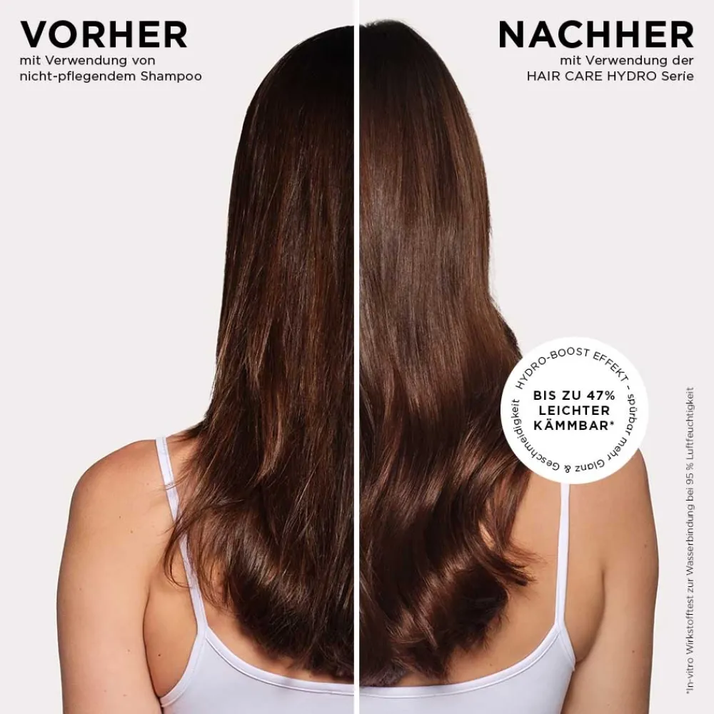 HYDRO SHAMPOO – Intensive Feuchtigkeit für trockenes Haar Das HYDRO SHAMPOO mit dem innovativen Hydro-Boost-Complex aus feuchtigkeitsaktivierender Hyaluron-like Rotalge und Aloe Vera spendet Ihrem Haar intensive Feuchtigkeit und stärkt es nachhaltig. Dank Multimoist CLR™ bleibt die Feuchtigkeit lang erhalten, für geschmeidiges, glänzendes Haar. Microbiom-freundliches Biotensid –Unsere Basisformulierung kombiniert mildes mikrobiom-freundliches Biotensid mit innovativen, natürlichen Inhaltsstoffen. Für sichtbar gepflegtes Haar, ohne zu beschweren – vom Ansatz bis in die Spitzen. – Intensive Feuchtigkeit & Stärkung – Langanhaltend hydratisiertes, glänzendes Haar – Sanfte, dennoch effektive Reinigung mit mikrobiomfreundlichem Biotensid Für Geschmeidigkeit und leichter kämmbares Haar – Ideal für stumpfes, trockenes Haar!