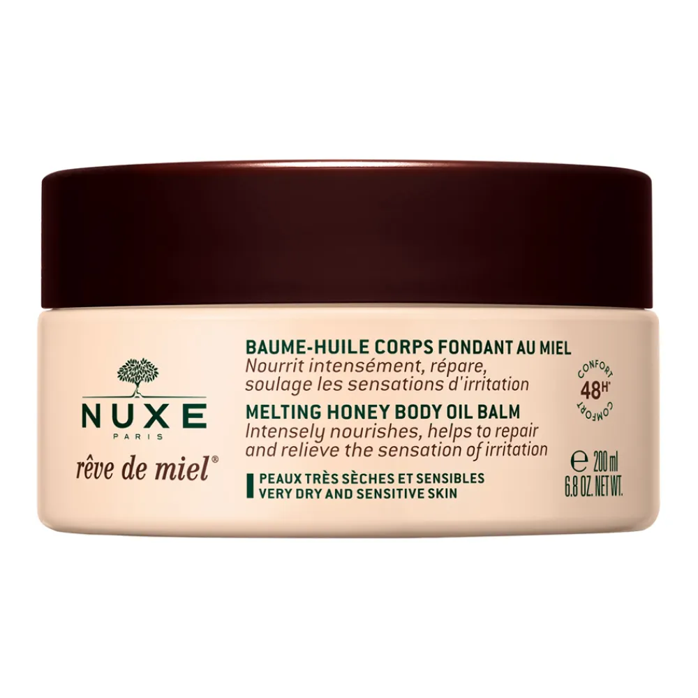 Der NUXE Zartschmelzende Honig-Ölbalsam für den Körper bietet eine intensive, wohltuende Pflege für trockene und empfindliche Haut. Die einzigartige Formulierung aus Honig und wertvollen Pflanzenölen nährt und beruhigt die Haut, während sie zugleich deren natürliche Schutzbarriere stärkt. Der Balsam versorgt die Haut 48 Stunden lang mit Feuchtigkeit und schützt sie vor schädlichen Umwelteinflüssen. Die seidenzarte Textur verschmilzt beim Auftragen sanft mit der Haut und verwandelt sich dabei in ein pflegendes Öl. Der zarte Duft aus Honig, Mimose und einem Hauch von Vanille verleiht Ihnen ein Gefühl von Geborgenheit und Wohlbefinden. Ihre Haut wird wunderbar geschmeidig und fühlt sich rundum gepflegt an.