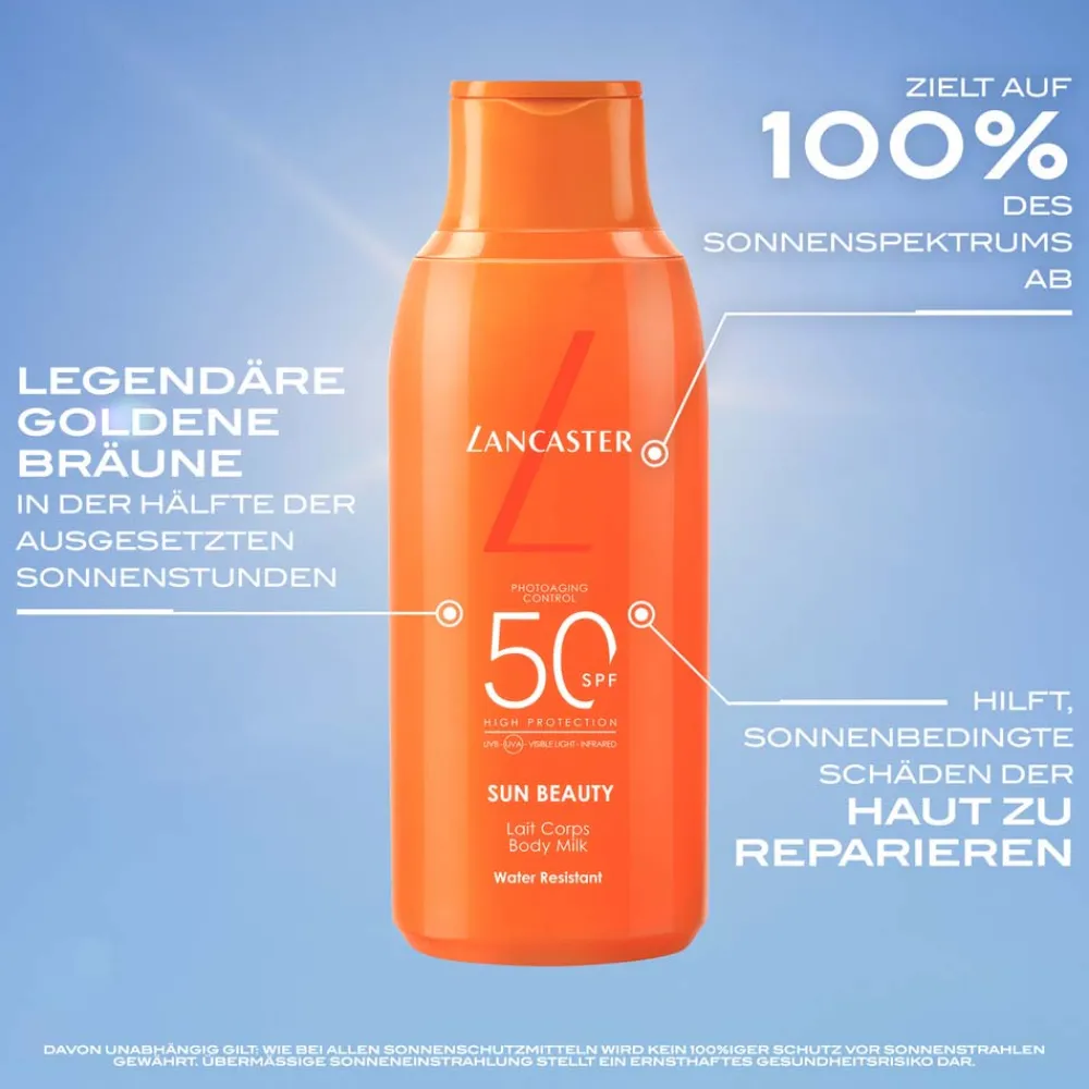 Die Lancaster Body Milk SPF 30 ist Ihr idealer Begleiter für sonnige Tage. Diese Körpermilch bietet Ihnen einen umfassenden Schutz gegen das gesamte Spektrum des Sonnenlichts. Ihre Formel ist nicht fettend, zieht schnell ein und hinterlässt keine weißen Rückstände. Dadurch erhalten Sie eine samtig-weiche Haut, die langanhaltend mit Feuchtigkeit versorgt wird. Die ozeanfreundliche Textur ist darauf ausgelegt, die Haut vor schädlichen Einflüssen zu bewahren und gleichzeitig sonnenbedingte Schäden zu reparieren. Lassen Sie sich von einer gesunden, goldenen Bräune verwöhnen, die in der Hälfte der üblichen Zeit entsteht. Ein wahrer Genuss für Ihre Haut, der Ihnen ein sicheres und angenehmes Sonnengefühl verleiht.