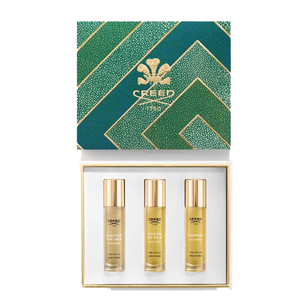 Packen Sie einen raffinierten Ausdruck von Exzellenz aus mit dem 3-teiligen Geschenkset für Damen, einer erlesenen Kollektion der berühmtesten Parfums für sie von The House of Creed.