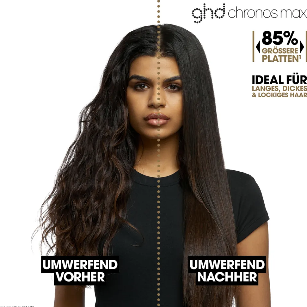 Der ghd – good hair day max Styler ist Ihr idealer Begleiter für ein schnelles und effektives Styling-Erlebnis. Mit seinen 85% größeren Platten ist er optimal für langes, dickes und lockiges Haar geeignet. Die innovative HD Motion-Responsive™ Technologie sorgt für eine präzise Anpassung der Wärme, sodass die optimale Temperatur von 185 °C konstant gehalten wird. Dies ermöglicht Ihnen, Ihr Haar mit dreimal schnellerem High-Definition Styling zu glätten oder locken, und das Ergebnis bleibt bis zu 24 Stunden erhalten. Dank der Ultra-Gloss Beschichtung profitieren Sie von 90% mehr Glanz und 2,5x weniger Frizz. Der automatische Schlafmodus bietet zusätzliche Sicherheit und den Komfort, den Sie sich wünschen. Mit dem ghd – good hair day max Styler können Sie Ihre Kreativität voll ausleben und sowohl glatte Looks als auch sanfte Wellen kreieren.
