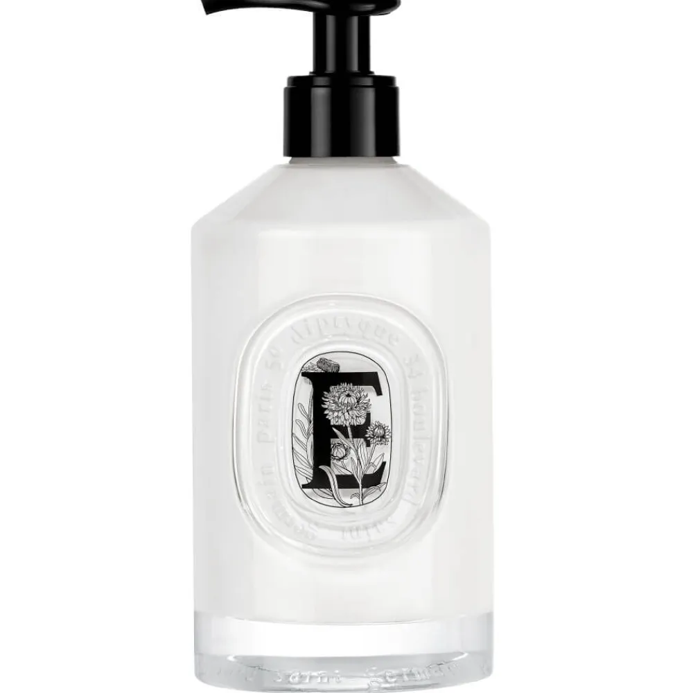 Der große Glasflakon der Diptyque Samtweiche Handemulsion beeindruckt durch seine elegante und klare Form. Das transparente Glas gibt den Blick auf die cremige, elfenbeinfarbene Emulsion frei, während der schwarze Pumpverschluss für eine einfache Handhabung sorgt. Der stilisierte, ovale Aufkleber mit botanischen Illustrationen verleiht dem Flakon eine subtile, klassische Note, die die Verbindung zur Natur kunstvoll unterstreicht. Dieser Nachfüllflakon vereint Funktionalität mit einem ansprechenden, zeitlosen Design, das sich harmonisch in jedes Ambiente einfügt und dabei stets einen Hauch von Luxus ausstrahlt.