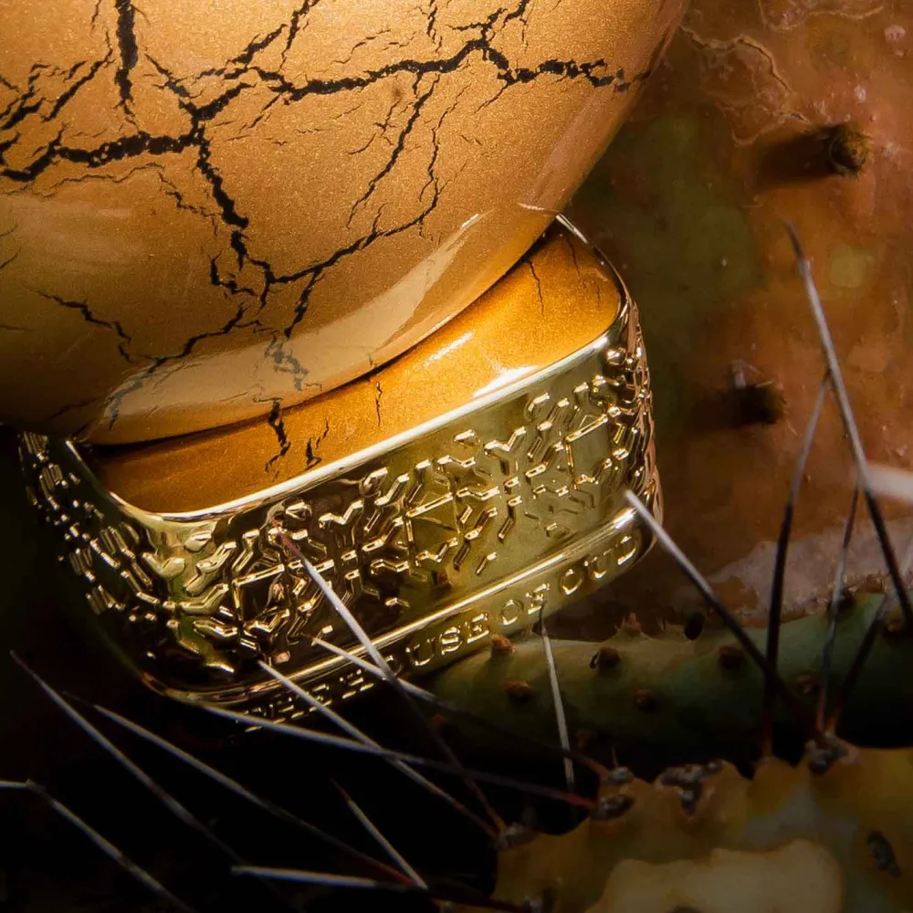 Das Design des Flakons von The House of Oud Eau de Parfum Spray ist ebenso faszinierend wie der Duft selbst. Die einzigartige, ovale Form erinnert an einen kunstvollen Stein, von der Natur geformt und von der Zeit geprägt. Der goldene Farbton des Flakons spiegelt die Wärme und den Reichtum der orientalischen Noten wider, während feine, dunkle Linien, die über die Oberfläche verlaufen, an die Risse der Wüste erinnern. Der kunstvoll verzierte Sockel verleiht dem Flakon eine majestätische Ausstrahlung. Dieses Designstück ist nicht nur ein Duftträger, sondern auch ein stilvolles Accessoire, das auf jedem Regal einen besonderen Platz verdient.