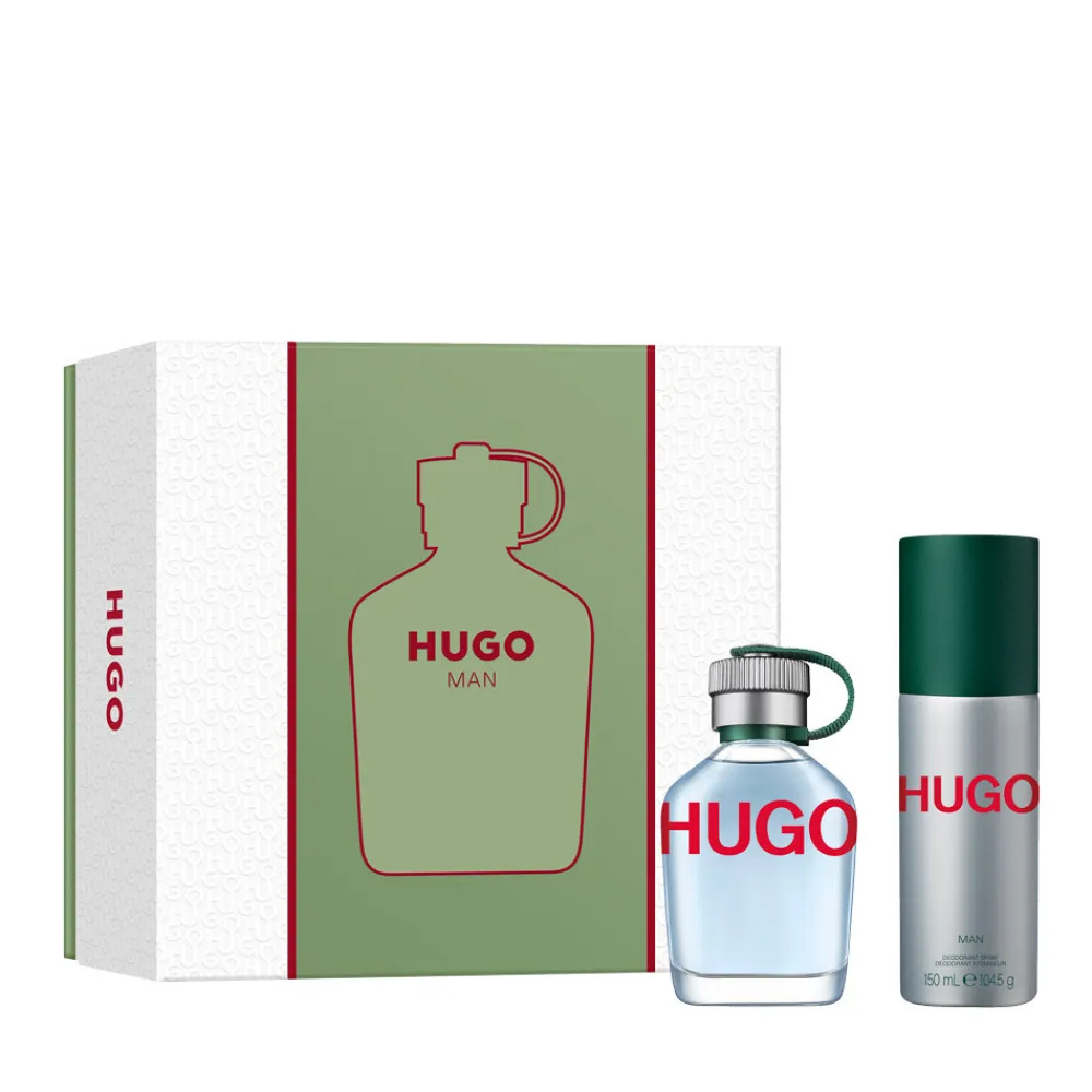 Das Set repräsentiert Eleganz und Stilbewusstsein, das sich auch in der optischen Gestaltung widerspiegelt. Der Flakon des Eau de Toilette besticht durch seine klare, kompakte Form mit einem auffälligen roten Hugo-Schriftzug, der auf dem transparenten Glas hervortritt. Der Verschluss, verziert mit einem dezenten grünen Band, harmoniert perfekt mit dem silbernen Design des Deodorant-Sprays. Beide Produkte zusammen ergeben ein visuell ansprechendes Ensemble, das im Badregal ebenso überzeugt wie in der Hand des anspruchsvollen Mannes. Dieses Set ist die ideale Wahl für stilvolle Präsente und sorgt für einen bleibenden Eindruck.