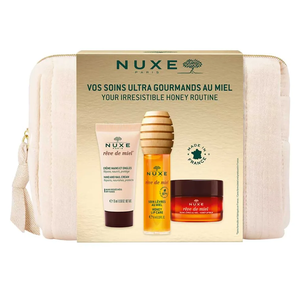 Das NUXE Essentials Reisegrößen Set bietet Ihnen eine luxuriöse Pflegeerfahrung für Ihre Lippen und Hände. Die Rêve de Miel Hand- und Nagelcreme verwöhnt Ihre Haut mit nährenden Inhaltsstoffen und sorgt für geschmeidige Hände. Der Lippenbalsam mit Honig schützt und pflegt Ihre Lippen intensiv, während die Rêve de Miel Lippenpflege für eine zusätzliche Feuchtigkeitszufuhr sorgt. Die perfekt abgestimmte Kombination sorgt für ein unvergleichliches Pflegeerlebnis, das Sie überallhin begleiten kann. Lassen Sie sich von der beruhigenden Kraft des Honigs verwöhnen und spüren Sie den Unterschied.