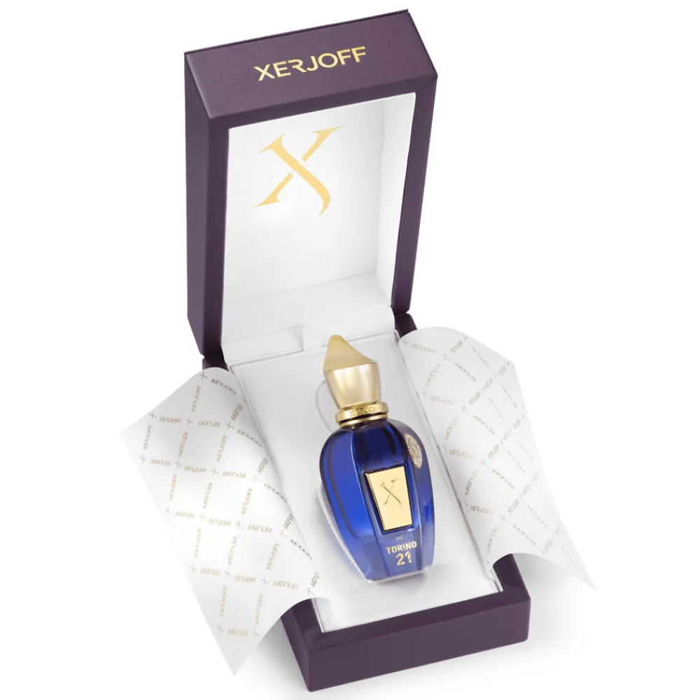 Der Flakon des Xerjoff Torino21 Eau de Parfum ist ein Meisterwerk anspruchsvoller Gestaltung. In tiefem Blau gehalten, spiegelt er die Eleganz und Tiefe wider, die das Parfum ausmacht. Die goldene Kappe setzt einen edlen Akzent, der die luxuriöse Anmutung unterstreicht. Die Form des Flakons, die an die Linienführung eines Tennisschlägers erinnert, bringt die Verbindung zur Welt des Sports auf kreative Weise zum Ausdruck. Ein weiteres Detail ist das prägnante Logo, das die exklusive Herkunft dieses einzigartigen Parfums betont. Diese Komposition aus Design und Duft schafft ein harmonisches Zusammenspiel, das sowohl optisch als auch olfaktorisch überzeugt.