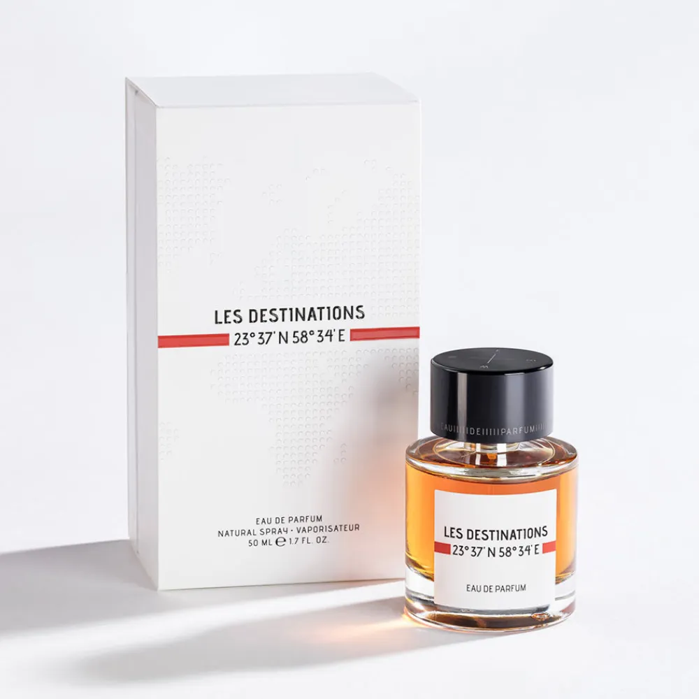 Der Flakon des LES DESTINATIONS Eau de Parfum Nat. Spray besticht durch ein klares und modernes Design. Die Glasflasche präsentiert sich in einer eleganten, zylindrischen Form, deren transparente Natur den warmen Bernsteinfarbton des Parfums stilvoll zur Geltung bringt. Der schlichte, schwarze Verschluss setzt einen kraftvollen Kontrast und verleiht dem Gesamtbild eine ansprechende Harmonie. Die präzisen Koordinaten auf dem Etikett unterstreichen die Inspirationsquelle der Duftkreation und laden dazu ein, auf eine imaginäre Reise zu gehen. Diese ästhetische Komposition aus Form und Farbe macht den Flakon zu einem zeitlosen Schmuckstück in jeder Parfümsammlung.
