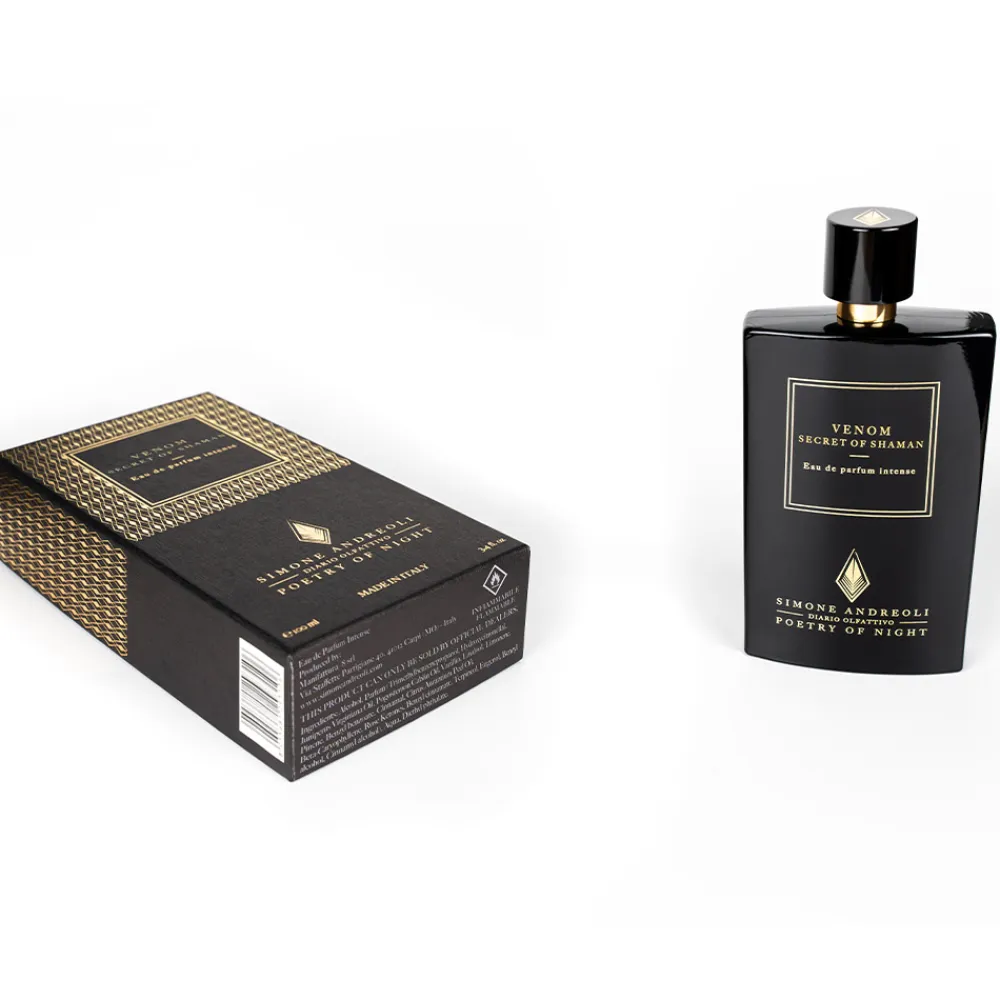 Der Flakon von SIMONE ANDREOLI Eau de Parfum besticht durch ein elegantes, schlichtes Design. Das tiefschwarze Glas wirkt geheimnisvoll und zieht den Betrachter in seinen Bann. Der goldene Verschluss und die dezenten Schriftzüge in Gold verleihen ihm eine edle Note und unterstreichen die luxuriöse Anmutung des Duftes. Die klaren Linien des Flakons spiegeln die Präzision und die kunstvolle Komposition des Inhalts wider. Dieses visuelle Meisterwerk ist nicht nur ein Behältnis, sondern ein Ausdruck purer Eleganz und tiefgründiger Mystik.