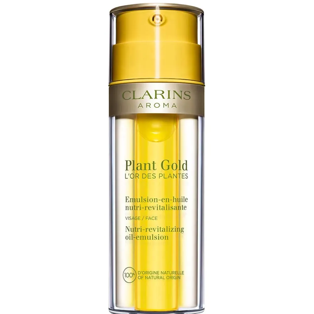 Clarins Plant Gold vereint die Kunstfertigkeit und Präzision erfahrenster Kosmetikerinnen mit innovativer Hautpflegetechnologie. Der einzigartige Zwei-Kammer-Flakon ermöglicht es, bei jeder Anwendung frisch die nährenden Öle mit der feuchtigkeitsspendenden Emulsion zu verschmelzen. Diese innovative Doppelformel, entwickelt von Clarins, umhüllt die Haut sanft und hinterlässt ein seidig-glattes, nicht fettendes Finish. Genießen Sie das Gefühl, als hätten Sie gerade eine professionelle Gesichtsbehandlung erfahren. Durch die sorgfältig abgestimmten Inhaltsstoffe wird Ihre Haut revitalisiert und strahlt eine natürliche Frische aus, die sie einzigartig erstrahlen lässt.
