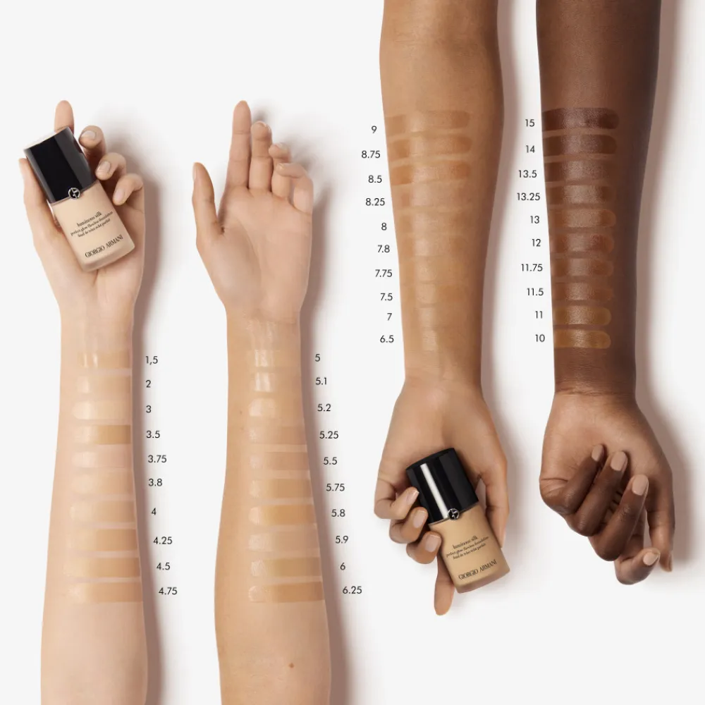 Die Armani Luminous Silk Foundation Travel Size fängt das Strahlen eines perfekten Teints ein und hinterlässt eine frische, vitale Ausstrahlung. Inspiriert von luxuriöser Charmeuse-Seide, umhüllt die flüssige Textur Ihre Haut und schenkt ihr ein seidiges, semi-mattes Finish. Die exklusive Micro–fil™ Technologie sorgt für einen Weichzeichner-Effekt, der Ihre Haut bei jedem Lichtverhältnis perfekt erscheinen lässt. Ob Tageslicht, künstliches Licht oder im Rampenlicht — das Ergebnis bleibt über Stunden frisch. Die Foundation bietet eine individuell anpassbare Deckkraft, die sich ohne Maskeneffekt von mittelstark bis maximal deckend variieren lässt. Ihre ölfreie und feuchtigkeitsspendende Formulierung ist für alle Hauttypen geeignet und in 31 Nuancen verfügbar.