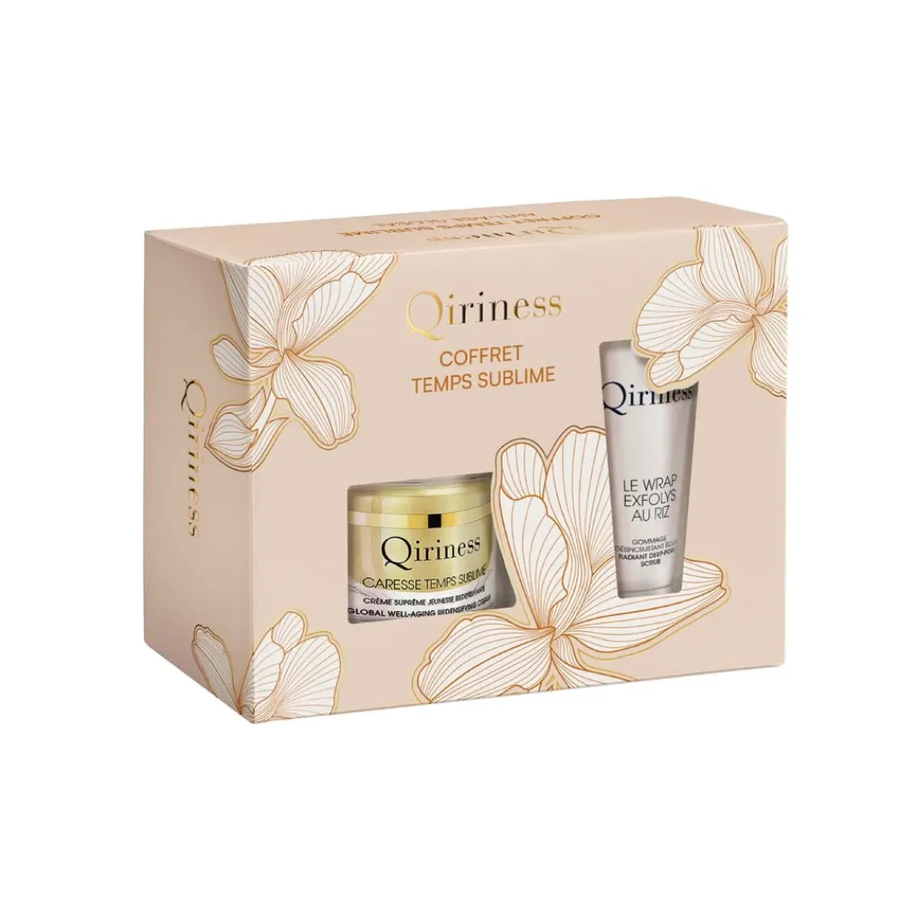 Das QIRINESS Templs Sublime Gift Set bietet eine umfassende Pflegeerfahrung, die speziell für die Bedürfnisse reifer Haut entwickelt wurde. Die Caresse Temps Sublime Creme überzeugt mit ihrer intensiven Well-Aging-Formel, die dazu beiträgt, Volumen und Elastizität zurückzugewinnen. Diese reichhaltige Creme enthält 93 % natürliche Inhaltsstoffe und wirkt als perfekter Begleiter im Kampf gegen die Zeichen der Zeit. Ergänzt wird das Set durch Le Wrap Exfolys au Riz, ein sanftes Peeling, das ebenfalls aus 93 % natürlichen Bestandteilen besteht. Dank seiner biomechanischen Wirkung entfernt es abgestorbene Hautzellen und verfeinert die Poren. Der Teint wirkt strahlend und erfrischt, wodurch Ihre Haut in neuem Glanz erstrahlt.