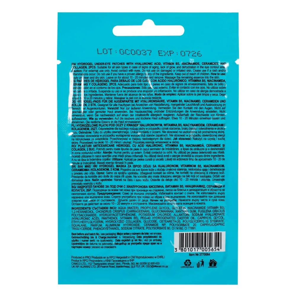 Das Set enthält zwei elegant geformte Patches, die in einem ansprechenden Blau erstrahlen. Die weiche, geschwungene Form passt sich optimal der Augenpartie an und sorgt für ein komfortables Tragegefühl. Verpackt in einem transparenten, wiederverschließbaren Beutel, der durch klare Linien und eine schlichte Gestaltung besticht, vermitteln die Skincyclopedia Hydrogel Under-Eye Patches with Hyaluronic Acid ein Gefühl von Frische und Reinheit. Der dezent aufgedruckte Markenname und die stilvolle Typografie unterstreichen das hochwertige Design, das perfekt in Ihr Pflege-Sortiment passt.