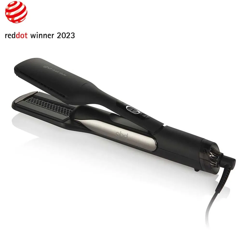 Der ghd – good hair day ghd duet style™ präsentiert sich in einem zeitlosen, schwarzen Design, das Eleganz und Funktionalität vereint. Die abgerundete Form des Stylers liegt optimal in der Hand und ermöglicht komfortables Styling. Die Platten mit ihrer Ultra-Glanz-Beschichtung gleiten sanft durch das Haar, während das 2,7 Meter lange Kabel Ihnen Bewegungsfreiheit gewährt. Die matte Oberfläche verleiht dem Gerät eine edle Anmutung, und die dezente Markenprägung unterstreicht seinen hochwertigen Charakter. Jedes Detail ist durchdacht, um das Styling-Erlebnis so angenehm wie möglich zu gestalten.