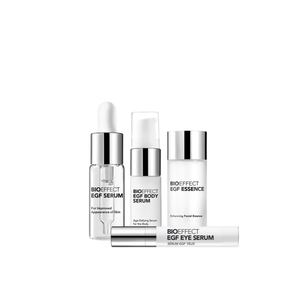Das Bioeffect EGF Serum Value Set bietet Ihnen eine umfassende Pflege für Gesicht und Körper. Im Mittelpunkt steht das EGF Serum, dessen sieben sorgfältig ausgewählte Inhaltsstoffe die Haut sowohl prall als auch zart erscheinen lassen. Falten werden sichtbar gemindert, während die Haut intensiv mit Feuchtigkeit versorgt wird. Speziell für die empfindliche Augenpartie entwickelt, minimiert das EGF Eye Serum Schwellungen und gleicht den Feuchtigkeitsgehalt aus, um eine straffe und strahlende Haut zu fördern. Die EGF Essence, ein leichtes Serum mit Gersten-EGF, optimiert die Aufnahmefähigkeit der Haut und verstärkt die Wirkung der nachfolgenden Produkte. Schließlich sorgt das EGF Body Serum für eine glattere und festere Haut am ganzen Körper, indem es sofort einzieht und langanhaltende Feuchtigkeit spendet.